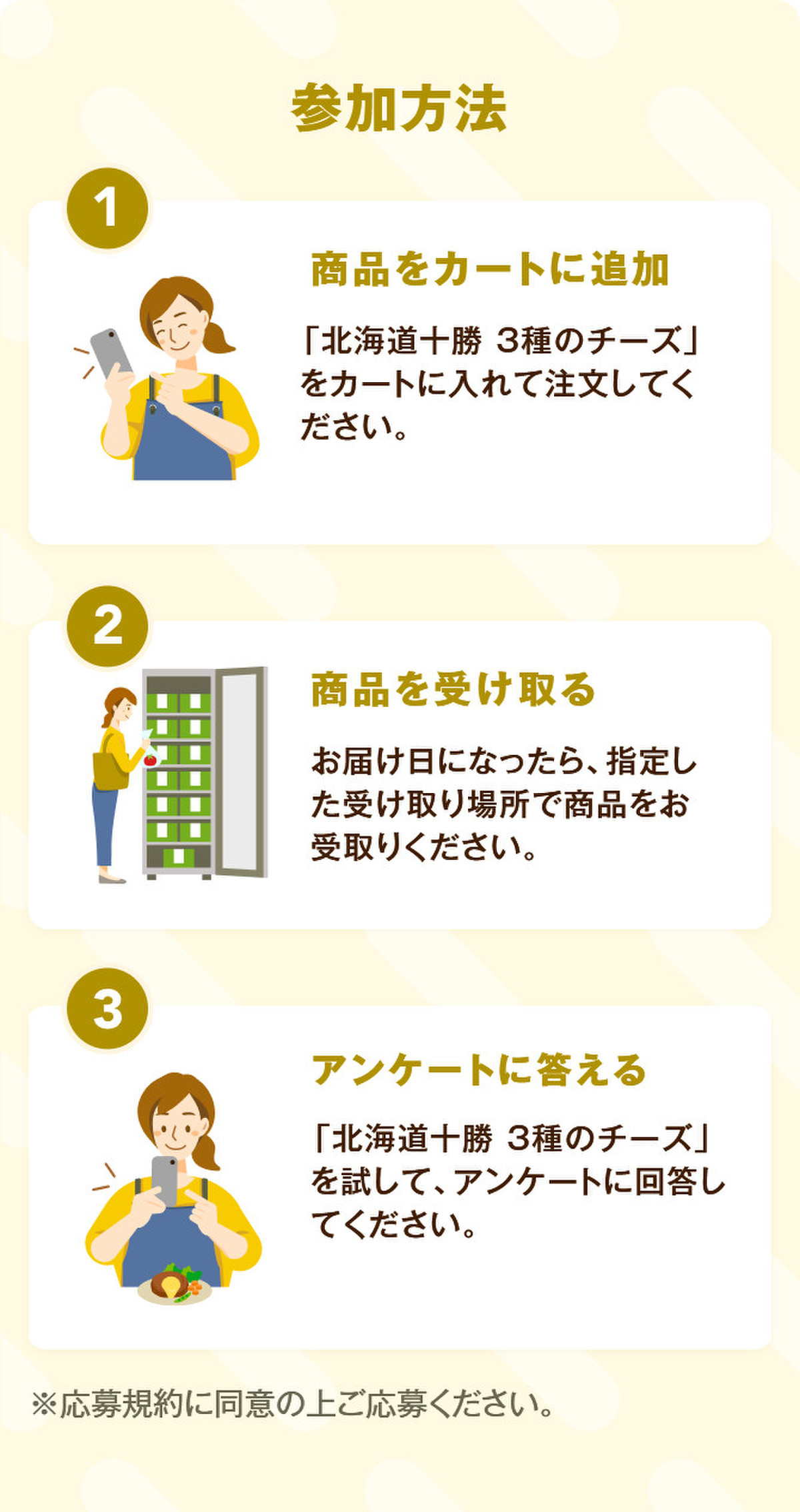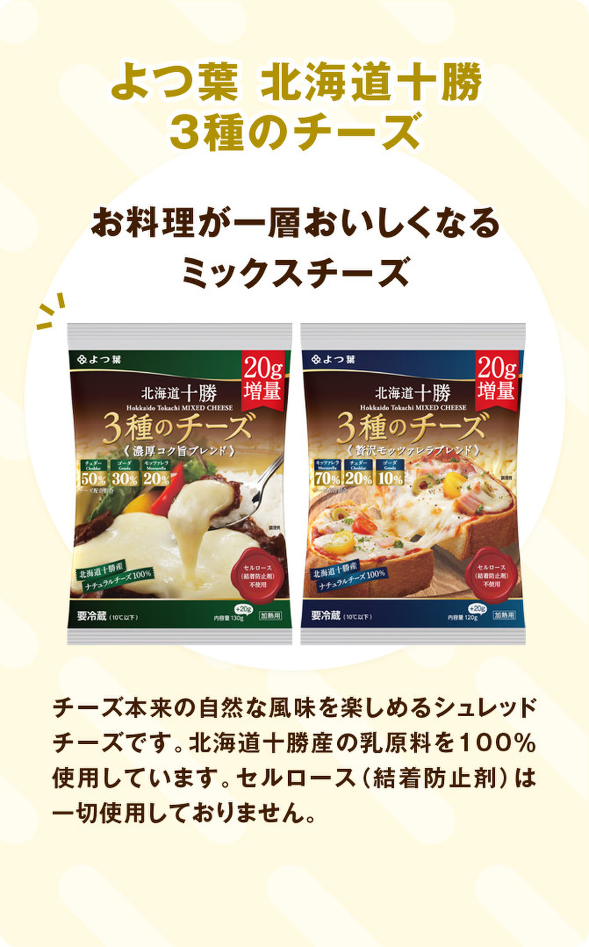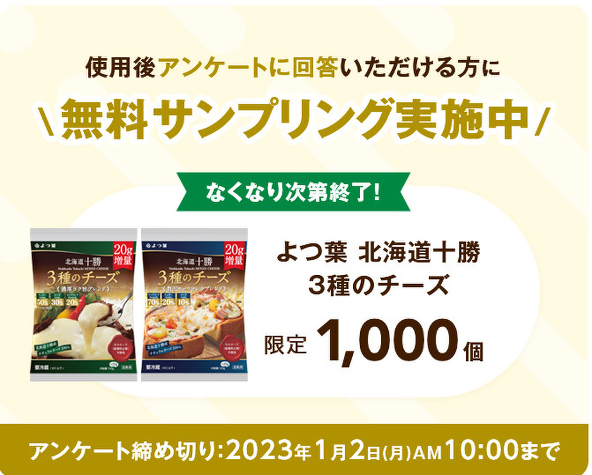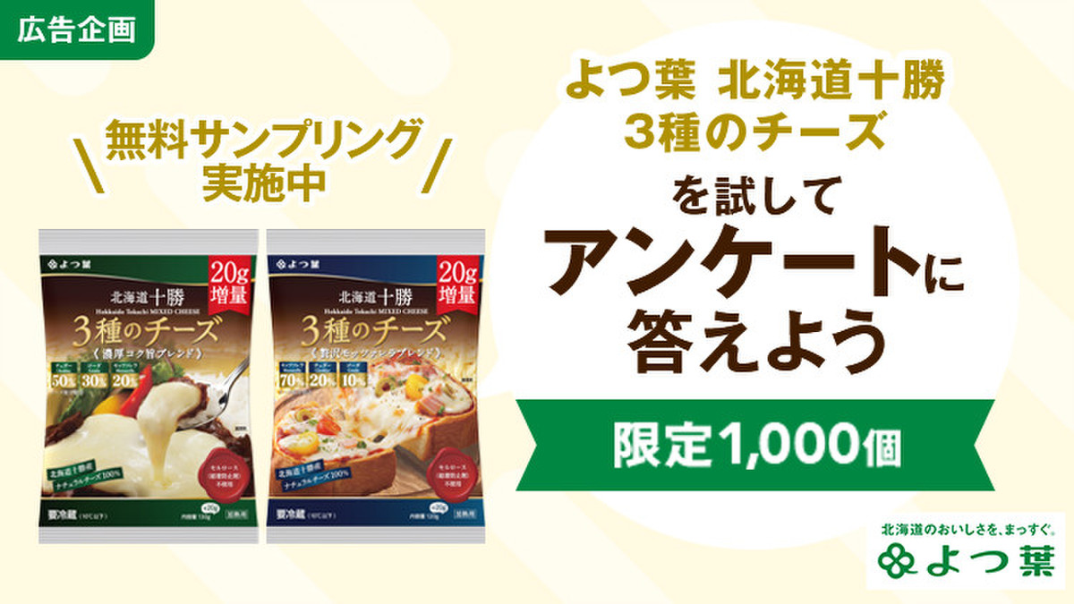 北海道十勝産の乳原料を100%使用した「よつ葉 北海道十勝 3種のチーズ」。使用後アンケートに回答してくれる方に、1000個限定で無料サンプリング!ぜひこの機会に試してくださいね。