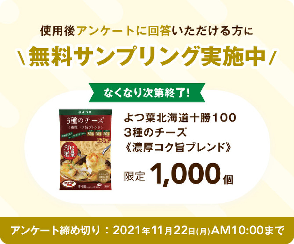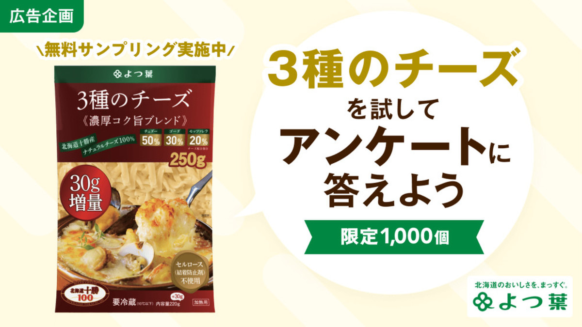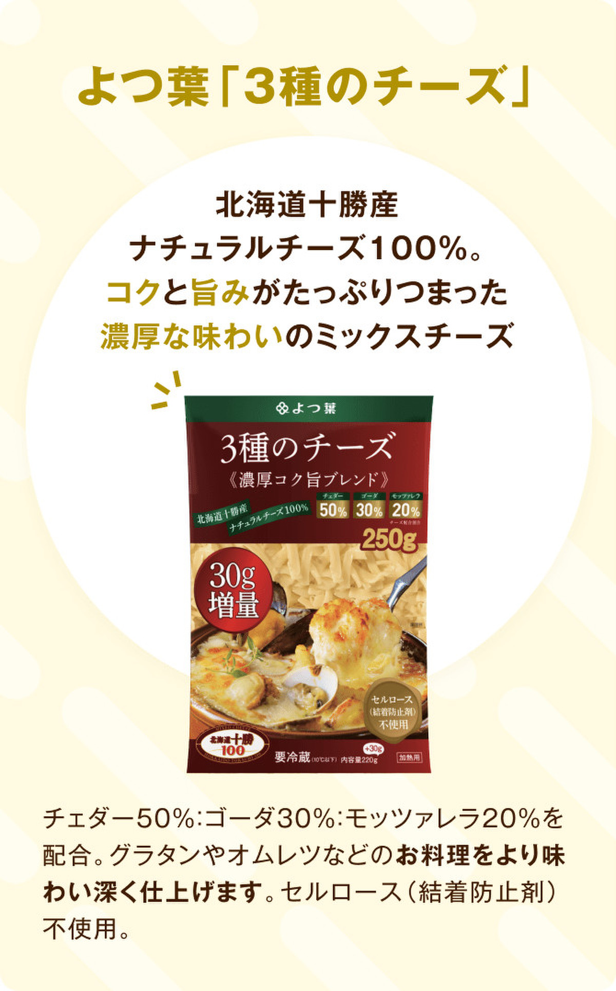 =============== 大好評につき1000個完売しました =============== 「よつ葉北海道十勝100 3種のチーズ《濃厚コク旨ブレンド》」は、北海道十勝産ナチュラルチーズ100%。お料理をより一層味わい深くする、コクと旨みがたっぷりつまった濃厚な味わいのミックスチーズです。